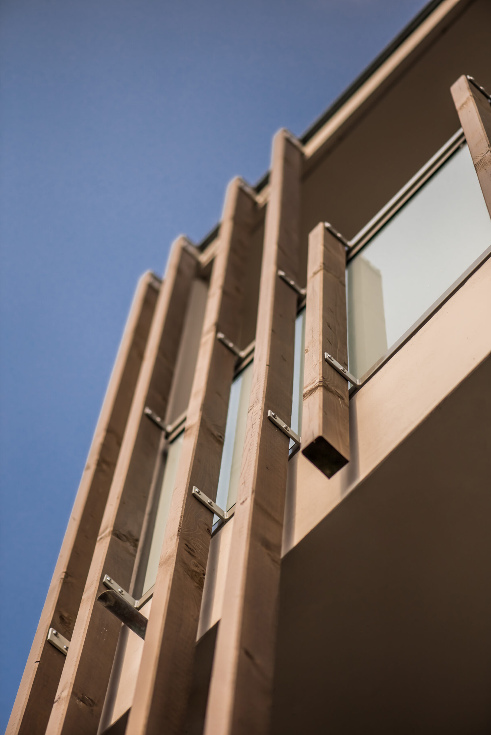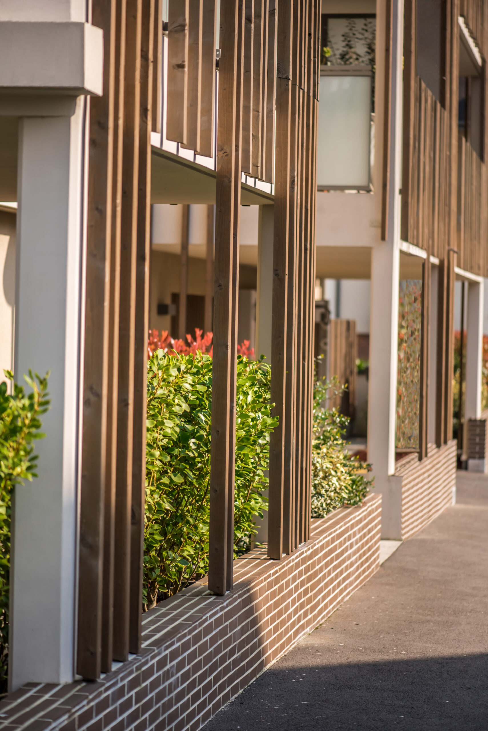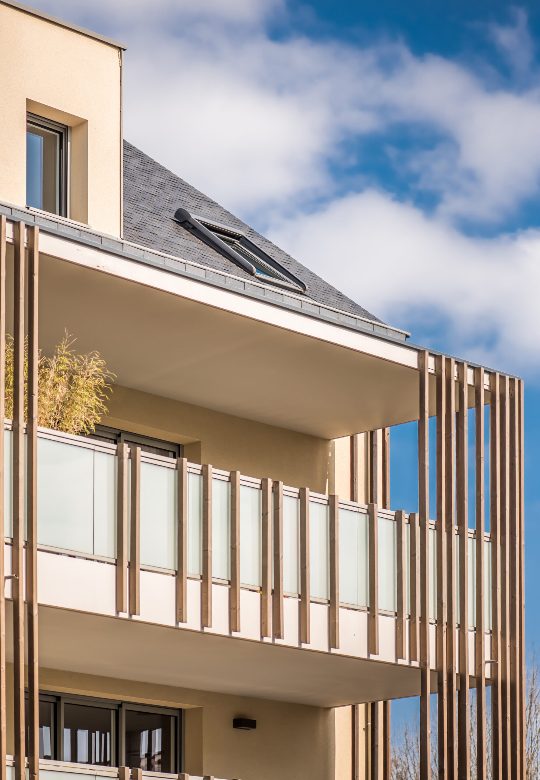 Les logements bénéficient de séjours orientés au Sud et se prolongent par des espaces extérieurs grâce à de généreux balcons ainsi que des terrasses au RDC et au niveau combles. La façade est animée au Sud par des teintes “or” en fond des balcons et par un jeu de lames verticales, réalisées à claire-voie. Doublées de gardes-corps en serrurerie et verre dépoli, elles préservent l’intimité de ses habitants. Avec son bardage bois qui lui apporte de la chaleur et de la noblesse, cette résidence se fond parfaitement dans son environnement avec élégance et sobriété.
