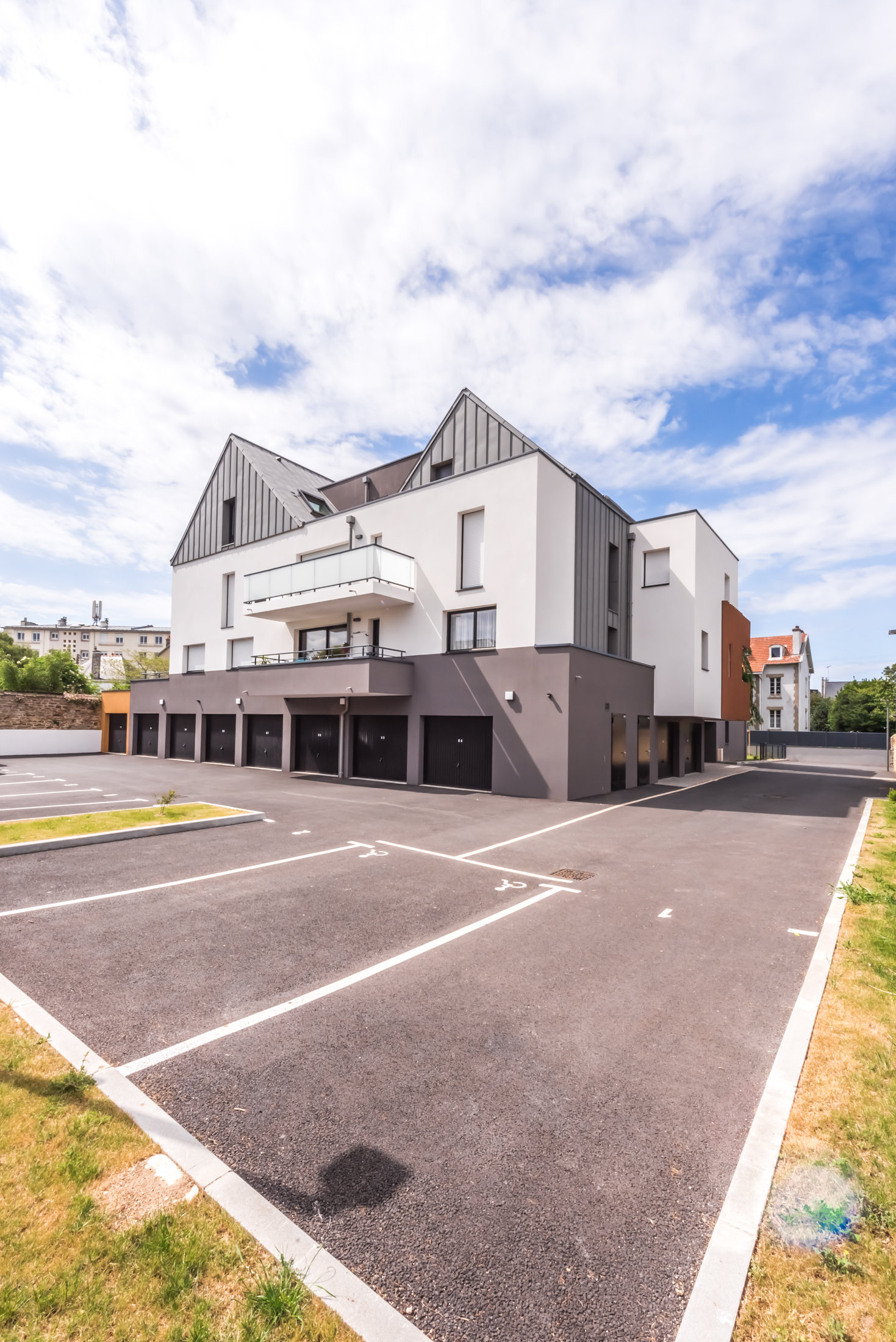 Dans ce quartier de Concarneau, la relation entre maisons de ville et villas balnéaires est très singulière. Cette résidence trouve sa place dans un beau cœur d’îlot, ceinturé de beaux murs de pierre, et du paysage des toitures tuiles en pourtour. Cette position centrale permet d’utiliser des formes simples et des matériaux pérennes :– 2 toitures zinc parallèles, pour perpétuer les gabarits de maisons du quartier.– des façades conçues en petits volumes distincts, avec du bardage composite aspect bois, des balcons claustras…Pour que l’identité d’un lieu devienne celle d’un projet. Ou l’inverse !»